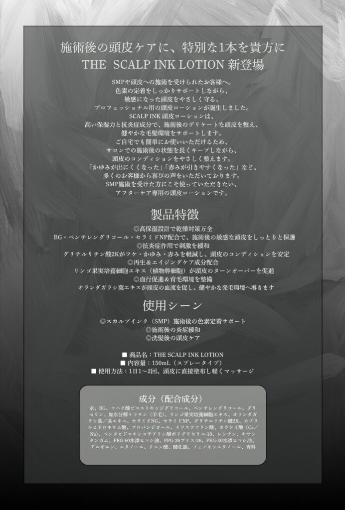 次の商品 頭皮ローション 会員限定 カテゴリー: アフターケア 説明 説明 施術後の必需品。 ◼️ 内容量:150m L(スプレータイプ) ◼️ 使用方法:1日1〜2回、頭皮に直接塗布し軽くマッサージ 関連商品 アフターケアセット割引10%OFF ! オリジナル頭皮ローション10本会員限定